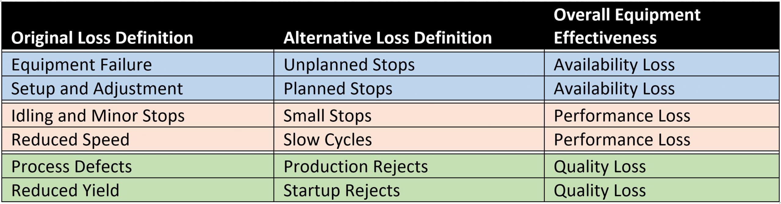As people have reflected on and applied the concept of the Six Big Losses, the losses have been renamed. In some instances, the new names probably better identify the reasons for production loss. In the table below, you can see the original and new definitions of losses and how they directly relate to the metrics used in OEE.