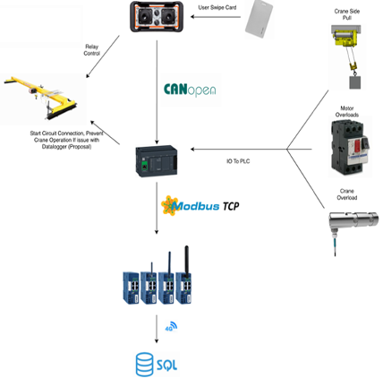 Mescon, in collaboration with ECM, has designed and created a remote monitoring system that is used in the crane industry. The system’s purpose is to monitor and record vital information related to actions of the crane operator, such as over-jogging, e-stops, motor overload and other fault conditions.